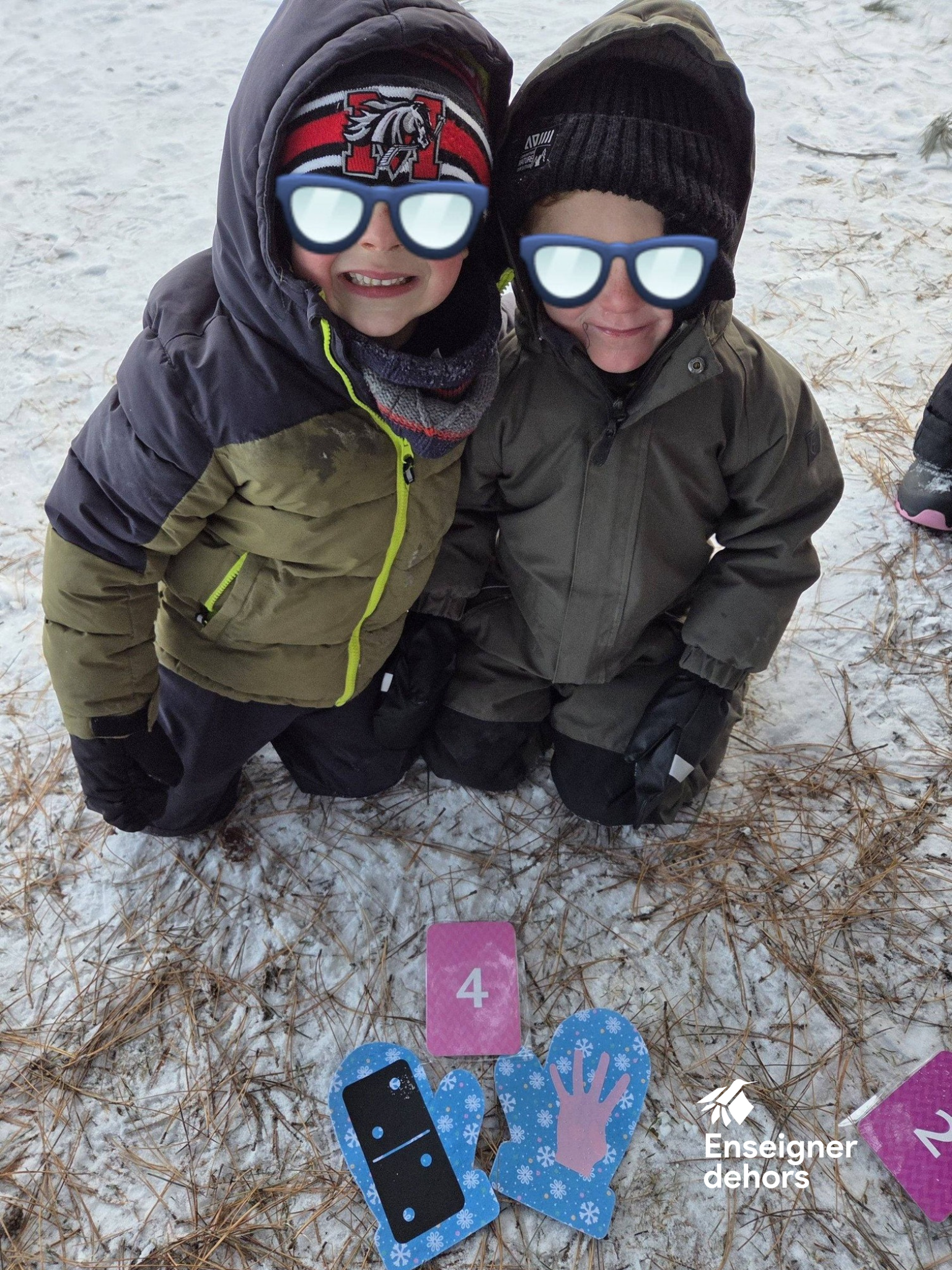 • L’enseignant.e affiche les moufles comportant des numéros sur la cour ou dans le boisé. Épingler sur les arbres avec des punaises ou avec des pinces à linge.